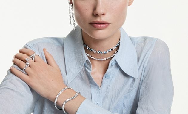 This customizable necklace is split between a gold-tone plated chain and a row of white Swarovski Crystal Pearls. A chunky carabiner closure is featured at the center, while the small heart motif offers a subtle expression of love. This versatile necklace can be worn alone, or taken apart and used as two bracelets. It’s also the perfect carrier jewelry for our Swarovski charms.