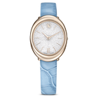 The Imber Oval timepiece conveys a modern approach to watchmaking through its glittering dial and timeless elliptical shape. This 24 x 26.3 mm stainless steel version is champagne gold-tone finished and features around 1000 clear crystals on its Crystalline dial. Amongst the slender hour markers, a single Roman numeral is displayed at 6 o’clock, while Swarovski’s iconic swan is placed at 12 o’clock. The Swiss Made watch is worn on a blue leather strap with crocodile print and offers a water resistance of 50m. Make this your go-to choice for sophisticated day-to-night styling.