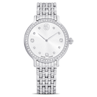 Adorned with 232 individual crystals, this glistening Imber watch is Swarovski’s finest expression of timeless elegance. The 31mm stainless steel design features a pavé bezel set with 52 clear crystals, while one additional crystal is also placed within the crown. On the sunray dial, 11 crystals in small and large sizes are used to mark the hours, along with a swan logo at 12 o’clock. Around the wrist, the watch’s most distinctive feature is the adjustable seven-link bracelet, which is stunningly set with 168 round-cut crystals. This Swiss Made watch is water resistant to 50 meters and matches seamlessly with Swarovski’s selection of Imber jewelry.